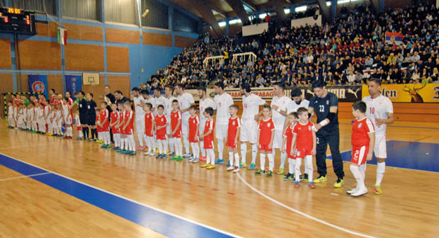 Reprezentativci Srbije i Irana u malom fudbalu – pozdrav publici pred početak meča. Foto: M. Lukić